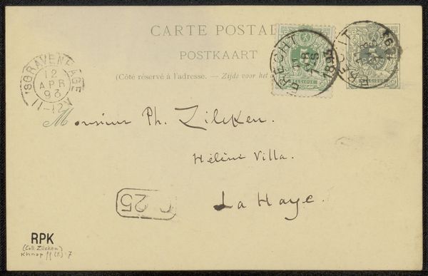 Curator: This postcard, “Briefkaart aan Philip Zilcken,” may have been sent around 1892. It’s crafted with ink as a drawing of sorts. What's your immediate impression, Editor? Editor: It’s intriguing! The ink seems almost hesitant, wavering, which gives the address a feeling of… what? Anticipation, perhaps? Or even a gentle sort of melancholy, knowing the ephemerality of correspondence. Curator: The script is indeed striking; almost a type of personal calligraphy, leaning toward an Intimist style, as if we're peering into a very private exchange. These postal exchanges allowed figures in the arts community to communicate their philosophies or even just the mundane tasks of social coordination, don’t you think? Editor: Absolutely, you feel as though you are viewing their correspondence. To think Zilcken, "artiste-peintre," received this; it gives me goosebumps, truly. Did it ever reach its intended recipient? Curator: Probably, the stamp suggests it went through the postal system! What I find interesting, however, is what its preservation says about our cultural institutions and what survives. Is a receipt confirmation any less valuable than an official painted canvas? Is it a glimpse into a friendship? An acquaintance? Was it love? Editor: It invites you to fantasize a whole history and makes the artistic practice intimate. And the very survival of something so fragile speaks volumes. It has been curated and kept, it became a part of a greater collection... which is simply amazing to imagine, don't you agree? Curator: I do. Each penned flourish carries a weight beyond its utilitarian function. This “Briefkaart aan Philip Zilcken” connects us to the subtle, interwoven networks that shaped artistic discourse and perhaps it even reflects their friendships back then!