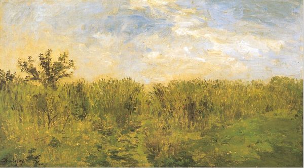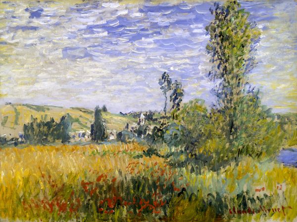 Curator: Looking at Vincent van Gogh's "Wheat Fields with Stacks" from 1888, what strikes you first? Editor: The palpable energy. The sky presses down, pregnant with rain. I imagine the very real labor of those harvesters racing against the approaching storm. The density of paint mimics the density of the task. Curator: Precisely. Van Gogh uses thick impasto, especially noticeable in the application of greens and yellows that compose the wheat field. The texture almost vibrates. It moves between naturalism and subjective feeling. Editor: It begs the question, what were the daily lives of the rural people represented in this canvas? The repeated forms of the wheat stacks give shape to cycles of production and labor. The labor is monumental, the scene overwhelming. Curator: I see. Consider the formal structure. See how he contrasts the flatness of the horizon line against the dynamism of the sky? The stacks ground the composition while simultaneously pointing upward, echoing the movement of the clouds. This suggests more than just the laboring body in isolation. It is work presented as being connected to the larger cosmos. Editor: A connection born of necessity. Van Gogh seems deeply interested in depicting material transformation—from field to stack to…eventually, perhaps, nourishment? The paint itself embodies this idea of raw material worked and reworked. It creates value through use and display. Curator: Note that the brushstrokes are visible and directional, lending movement and life to otherwise static subject matter, but what do they accomplish? By what logic? Editor: Perhaps that he did work *en plein air*, but that aside, such a heavily labored piece has a sort of honest transparency. The labor is self-evident in the outcome; to produce work one must produce things from work. It invites reflection on consumption. Curator: So it seems, the work prompts differing angles from which to understand this vista. Editor: Indeed. Different crops for different purposes.