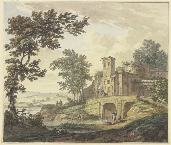 Curator: William Taverner's "Landscape Composition" presents a ruin, doesn't it? But what do ruins signify? Editor: Well, decay, maybe? This watercolor feels melancholy, with the crumbling structures and muted colors. What visual echoes do you hear? Curator: Consider the persistent allure of ruins across cultures. They speak to the past’s enduring presence, reminding us of transience. Taverner uses the ruin as a stage. Editor: A stage? Curator: Yes. It's a stage for reflection on time, memory, and perhaps even the cyclical nature of civilizations. The ivy almost feels hopeful. What have we learned? Editor: That ruins aren't just about what's gone, but what remains. Curator: Precisely, and what those remnants inspire within us.