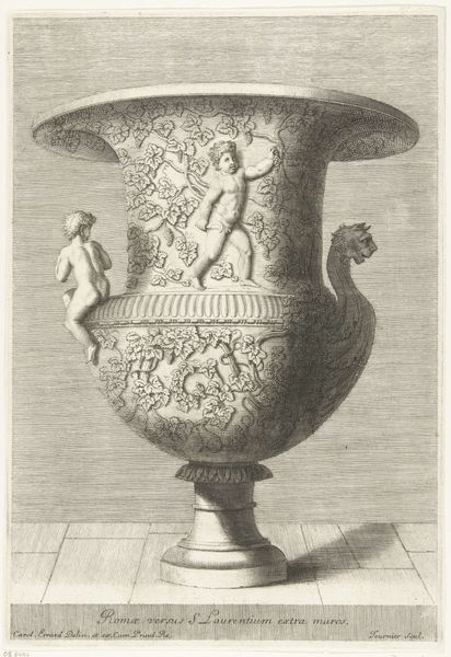 This print, made by Jacques Stella, depicts an elaborate vase with a putto on its lid. As a print, its value lies in the skilled labor of the engraver, who translated a three-dimensional object into a two-dimensional image that could be widely distributed. Note the vase itself; its form evokes ancient pottery, yet its surface is intricately ornamented. The interlace pattern on the lower portion is particularly interesting. It is a classic example of trompe l'oeil, an illusionistic effect mimicking basketry. This creates an intriguing contrast. An object made of precious metal, aspiring to the humbler aesthetic of craft. The vase’s handles and lid are equally ornamental, crowned by the figure of a putto. This combination of classical form and decorative excess speaks to the tastes of the wealthy. These were the patrons who fuelled the luxury trades in Stella’s time. Ultimately, this print reminds us that even seemingly straightforward images are the result of complex social and economic forces, blurring any clear distinction between art and craft.