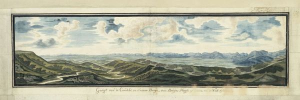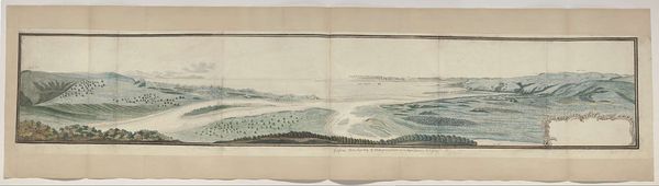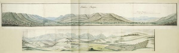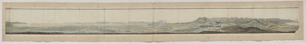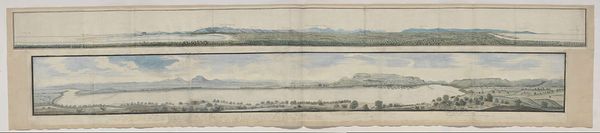 Curator: This is "Panorama of Algoa Bay from its western shore," created around 1778 by Robert Jacob Gordon. It's rendered with watercolor and colored pencil. Editor: The cool, muted palette immediately evokes a sense of distance, both geographically and temporally. There's a strange dichotomy in the dual panels; mountains and landscape juxtaposed against the flat plane of the bay. Curator: Absolutely, the bay in the lower register certainly emphasizes the distance of this colonial outpost. Visually, Gordon’s handling of the distant mountains reminds me of a symbolic horizon line, something both real and dreamlike to his Dutch viewers back home. They become potent symbols of the uncharted. Editor: Interesting observation! And that hazy light—is it romantic idealism, or practical necessity given the limitations of his pigments? The structuralist in me leans toward seeing those receding mountain ranges as a constructed visual language. A kind of promise, or perhaps even a claim. Curator: It’s both! Gordon would have been very aware of the allegorical weight of landscape in his day. Light equals clarity and, thus, truth in enlightenment thought. These details can reveal the optimism, maybe even naivete, embedded within this colonial project. Editor: But look how meticulously he renders the receding horizon—every detail diminishes with perfect, almost mathematical, accuracy. The color gradients give shape, and the repetition of horizontal strokes pulls everything towards a vanishing point of possibility. He even includes botanical references on the middle ground. Curator: Botanical accuracy in such sweeping depictions suggests a will to dominate. He records specimens but from a fixed point, from afar, as trophies of knowledge. That feels representative of a Western approach to the unknown and the unknowable that resonates through our history. Editor: It certainly does offer up compelling arguments around power, control and discovery through the formal arrangement of color and structure! I hadn't considered those layers, thanks for sharing that interpretation. Curator: Likewise. Looking at Gordon's "Panorama of Algoa Bay" once again, the layered perspective feels even richer, filled with longing, science, and the burden of history.