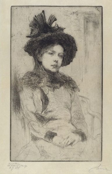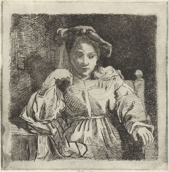 Curator: This etching by Edgar Degas, made between 1860 and 1862, is titled "Marguerite De Gas, the Artist's Sister." Editor: It has this very delicate, almost melancholic feel to it. She looks like she is caught between introspection and posing for the portrait. There is vulnerability in her gaze. Curator: Degas, although known to align himself to the Realist movement, also embraced printmaking innovations of his time, particularly etching. In a time when portraiture was becoming a popular means of publicly communicating family status, etchings became ways of capturing informal, intimate, almost snapshot-like images within the domestic sphere. Editor: I see that, yes. I'm struck by the use of the etching needle, creating a sense of unfinished spontaneity—it does feel very immediate, not at all stilted. What's also coming to my mind is the way the gaze of women have been framed throughout the art historical canon. And to see here the sister captured perhaps outside of public performance or life offers new lenses on gendered expectations. Curator: That reading speaks directly to debates about Realism and Impressionism as challenging earlier academic standards in state-sanctioned salons and institutions, and in doing so provided visual languages for personal and direct experience. Also of significance to note is the role Marguerite took in caring for Degas during his struggles with blindness in later life. It highlights the reciprocal relations in the familial unit and how we think about models and muses. Editor: Thinking about that exchange, it really makes you wonder about the politics inherent in the act of portraiture. It makes me think, how often are women’s roles shifted when art making, fame and access become tied to men's accomplishments, to brothers or lovers? It almost feels she is relegated to the role of prop in this intimate snapshot. Curator: It brings to the fore how we view labor within a familial dynamic. It challenges conventional narratives surrounding artist-model relations and reveals overlooked dimensions of care, kinship, and perhaps gendered power dynamics. Editor: Exactly. Seeing the print now knowing this, this artwork offers not only visual insight but a broader conversation about visibility, labor, and personal connection. Curator: Indeed. The personal stories enrich this etching and invite conversations about art, family, and lived experience beyond aesthetic preferences.