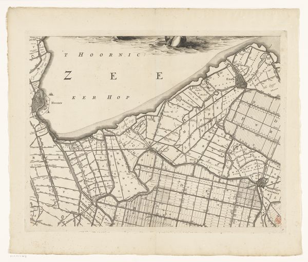 Curator: Here we have “Kaart van Kennemerland en West-Friesland (achtste deel)", created around 1680 by Coenraet Decker. It's currently held at the Rijksmuseum. Editor: The stark detail of the landscape captured in ink has a strange, alienated feel. The cartography aesthetic lends this strange emotional distance, although the human presence is so evident everywhere. Curator: Precisely. Maps throughout time don’t just show land, they reflect the power structures inherent in owning, dividing, and controlling territories. Consider this from a psychological viewpoint: what does it imply when a society seeks to quantify and delineate its very environment? Editor: It is quite a contrast to consider the physical act of surveying and rendering such minute detail from direct work upon the earth. Look closely at the engraving—the paper shows marks of use, the pressed lines… each speaks to the labor necessary to its creation. Curator: And consider how landscapes – especially the land divisions indicated by such labor as you point out– take on symbolic meaning within a culture. Boundaries marked in ink, signifying ownership and power – but at what cost to the collective sense of the land? Is it possible this is even echoed in the lines etched deeply in the plate? Editor: Interesting. I hadn’t considered it that way, but you might have a point about that kind of violence being recorded in the making process. Consider the human endeavor of transforming raw material to create this tool and represent our spatial relationship… This tangible representation of our environment surely reshapes how we even consume land. Curator: Absolutely. It creates a shared cultural schema. Whether used for practical way-finding or displayed as a marker of societal standing, images like these carry layered significance, conditioning how generations view the world. Editor: Well, thinking about it materially, it is amazing how the creation and consumption of mapped boundaries ultimately altered land usage and thus social relations as much as simply mirroring an existing reality. Thanks for your insightful angle. Curator: Likewise! It's these subtle, yet significant aspects of our interaction with art which reveal how truly complex any image's place is in society, from then to now.