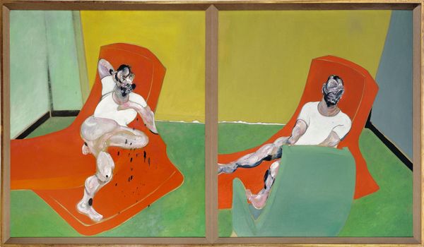 Curator: "Three Portraits: Posthumous Portrait of George Dyer, Self-portrait, and Portrait of Lucian Freud," a triptych rendered in oil paint by Francis Bacon in 1973. It’s strikingly unsettling; the figures are distorted and the atmosphere is thick with tension. What's your take? Editor: It is incredibly haunting. I notice the smeared quality of the figures. Is it possible to connect this aspect of the painting to a critique of portraiture's typical role in society as something flattering? It is meant to solidify the subject's legacy. In this painting, there seems to be no legacy; just bodies breaking down. Curator: Exactly. Think about Bacon’s process, his intense manipulation of paint. What labor goes into the construction of these portraits? The application and reworking of paint embodies not only emotional turmoil, but literal deconstruction of form. Bacon used a variety of tools, from brushes to rags. The evidence of physical manipulation here underscores the manufactured nature of identity itself, breaking with tradition and making us consider the means of production of an image and its role in commodifying, or in this case, deconstructing, a persona. Editor: That's a good point; it sounds like his methods deliberately prevented an easy reading. But I am not familiar with what exactly the art scene was in London at the time. Is it connected to something else? Curator: Absolutely. We must see this work against the backdrop of Post-War austerity and social shifts in England. How would such constraints change an artist’s practice? How would scarcity impact not only what one consumes but what one creates, thereby challenging established norms surrounding consumption? Editor: This materialist lens really enriches my interpretation! Thank you, this really shifts how I perceive these portraits. Curator: I'm glad to hear that, it encourages a dialogue that transcends the artwork to encompass something else: labor.