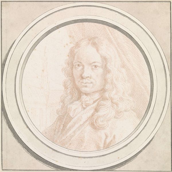 Frans Decker rendered this portrait of Gerrit Berckheyde in sanguine, a drawing medium composed of red chalk. Note the curtain draping in the background. It is a theatrical motif dating back to antiquity, used to frame a subject or scene. The device indicates importance, as though the sitter is playing a part on a stage, worthy of admiration. Though its origins are rooted in classical drama, we see it echoed in later works across Europe, from royal portraits to domestic scenes. The inclusion of a church tower in the distance is also notable. Architectural elements often serve as symbols of stability and civic pride, rooting the subject in a specific place and time. Consider how the meanings of these symbols shift, blend, and re-emerge across various cultural contexts and historical eras. These symbols are never fixed.