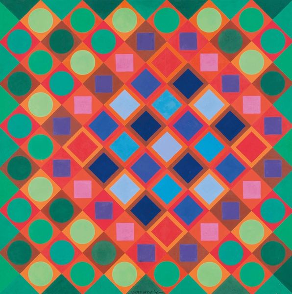 Curator: Victor Vasarely's "Gaia," created in 1975 with acrylic paint, is a striking example of Op Art. Editor: The immediate impression is that of a vibrating field, a pulsating surface of geometric forms, reminiscent of heat shimmering above the earth. Curator: The hard-edged forms certainly play with perception. Note how the interplay of warm reds and cool grays, arranged in a precise grid, generates the illusion of curvature, of space bending in on itself. The systematic arrangement of squares creates the optical effect. Editor: The title, "Gaia," referencing the ancient Greek earth goddess, brings an intriguing dimension. The expanding and contracting forms might symbolize the planet's breathing, its cycles of growth and decay. The colors themselves – a ruddy, earthy red and the somber gray – suggest a primal connection to the earth's elements. Curator: Precisely. The symbolism layered within the structural forms provides context. One observes the relationship between the square, a static geometric symbol, and the suggestion of dynamism implied by color values in progression across the work's flat surface. Editor: I'm struck by how the artist manages to evoke a sense of organic vitality from such rigorously constructed components. It speaks to the underlying order inherent within nature, translated into an abstract pattern that engages not just the eye, but the mind as well. Perhaps Vasarely is visualizing Gaia’s heartbeat – geometric harmony pulsing through the very structure of the planet. Curator: Indeed. "Gaia," beyond its dazzling visual effect, encapsulates a deeper reflection on structure, representation, and our very place in it all. Editor: A compelling vision, seamlessly linking the language of geometry to the powerful archetype of mother earth.