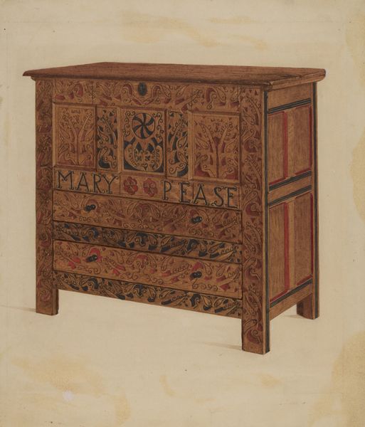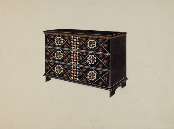 This drawing of a chest of drawers was made by Charles Henning at an unknown date. The details, look at those tiny rows of dashes forming borders, they are so methodical, right? It makes you wonder what Henning was thinking, repeating these small marks, like counting the drawers, or maybe a steadying breath. Now, think about the surface. The green and red are opaque, thick enough to hide the paper underneath, but they don't have a lot of texture. The overall effect is flat, but those red tulips give it pop. I'm drawn to the cross shape on the side panel; it's simple but not quite centered, like a happy accident. It's slightly off, adding a nice bit of character to the overall design. Henning's approach makes me think of other self-taught artists like Bill Traylor, who find their own way of seeing and making. Art isn't always about perfection; it's about the conversation, the questions, and the way we see the world around us.