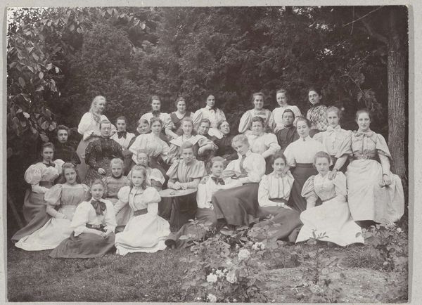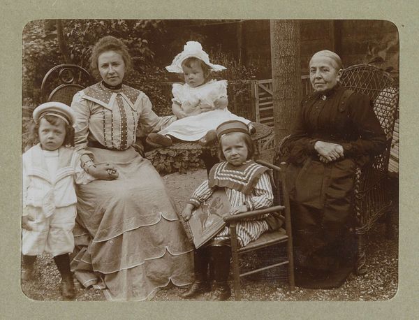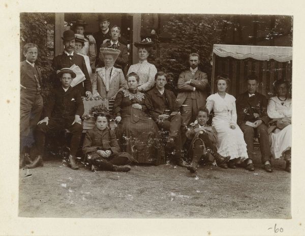 Curator: Looking at "Groepsportret van de familie Hoogendijk in een tuin," a photograph taken between 1898 and 1902, currently held at the Rijksmuseum, I’m struck by the family patriarch in what appears to be a military uniform, a detail that feels both authoritative and staged. Editor: My immediate feeling is of a carefully constructed hierarchy, both in the composition and in the subtle expressions. There’s a formality to the posing that feels very of its time, but almost oppressive. It makes me wonder about the unwritten rules dictating their lives. Curator: It's intriguing how photography, still relatively novel at this time, was quickly adopted to visually codify societal structures. Van der Kop employs Pictorialism, a style attempting to elevate photography to high art. The soft focus and careful arrangement are consciously artistic. Editor: Absolutely. Pictorialism aimed to imbue photography with the aesthetics of painting, attempting to justify its place among traditional art forms. But in doing so, it can sometimes mask the reality, presenting an idealized version of family and status. It speaks volumes about how elites wish to be perceived and remembered. What narrative do you glean from the expressions on their faces? Curator: The solemnity, bordering on melancholic, does suggest deeper psychological currents. The women's posture conveys submission while the men possess a stiff reserve; all perhaps conforming to roles rather than revealing authentic emotion. Editor: It's this quiet conformity, the stiff upper lip mentality perpetuated in part by visual cues, which makes me uneasy. Group portraits like these cemented societal expectations, especially about family roles. Notice how each member's clothing signifies status and the unspoken pecking order. Do you perceive this as a mirror reflecting cultural values, or a directive designed to preserve norms? Curator: Perhaps it functioned dually. Photography, even when seemingly objective, can still imprint an ideological stance, reinforcing specific cultural narratives and maintaining their resonance. Editor: The somber tones of the sepia image further amplifies its message—a carefully curated presentation of an elite Dutch family, hinting at stories beneath its static facade, inviting questions about agency, expectations, and self-representation. I'm glad we considered this group dynamic today. Curator: Indeed, revisiting images such as this one serves as a poignant window into the complex choreography of history.
