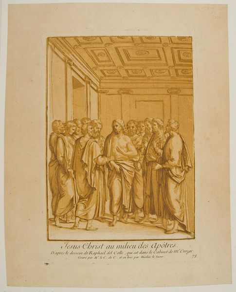 Curator: This is Jean Charles Levasseur’s engraving, "Scene from Voltaire's 'Oedipe'," housed here at the Harvard Art Museums. The crisp lines and dramatic composition give it an immediate sense of theatrical intensity. Editor: Absolutely. The expressions feel heightened, almost operatic. It makes me think about the power dynamics at play in the story itself. Curator: Voltaire’s "Oedipe," of course, reinterprets the ancient Greek tragedy. Levasseur captures a moment of high tension, likely a confrontation or revelation central to the narrative. Editor: How does the print's visual language reflect the intersectional themes present in the play: power, fate, gender roles? Oedipus is facing his truth and the consequences. Curator: This print offers a fascinating glimpse into the popularization of classical narratives through 18th-century visual culture. It’s also interesting to consider the role of imagery in shaping public perceptions of these stories. Editor: I'm struck by how a seemingly straightforward image can open up discussions about history, gender, and the narratives we inherit.