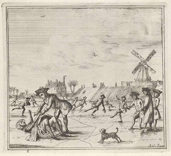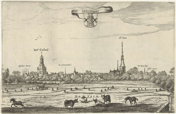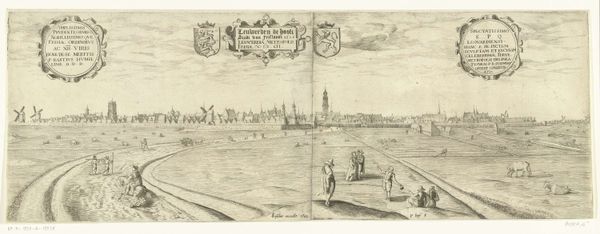 Curator: This cityscape really captures a specific moment in time, doesn't it? What strikes you first? Editor: The sheer vastness of the sky dominates the composition. It feels a little overwhelming, as if dwarfing the people and buildings below. And the linework, so precise! Curator: Indeed. What we're looking at is "Gezicht op Franeker 1598," a print made in 1598 by Pieter Bast. The artwork provides a window into the Dutch Golden Age. Consider the rise of mercantilism and burgeoning civic pride that shaped cityscapes as potent emblems of prosperity and stability. Editor: I’m captivated by the detail. The way the artist has used line to describe form and texture...look at the buildings! It seems almost photographic in its realism, for its time anyway. Curator: And think about the intended audience and context. Franeker was home to a burgeoning university. These images would have played a key role in promoting the town as a place of knowledge. The foreground figures, engaging in everyday activities, create a sense of lived experience that contrasts sharply with the imposing structure in the background. The positioning of individuals and gender is worthy of attention. Editor: It’s intriguing how those foreground figures are arranged. There’s a definite separation. The use of perspective cleverly flattens the city behind them. How are we to read that spatial compression? Is it intentional? Curator: It reflects societal norms. Notice the composition mirrors contemporary societal hierarchy? The wealthier townsfolk occupy the fore, with the more industrial areas appearing at a further remove, thus highlighting who benefited from increased mercantile opportunities. These themes speak volumes about power relations. Editor: An excellent point. Analyzing it purely as an aesthetic object, the artist's manipulation of line and space generates a compelling tension, one that reflects both beauty and detachment. Curator: It certainly urges us to look closely at who is being centered and who is pushed to the margins in our narratives. Editor: Indeed, a perfect synthesis of form and ideology! Curator: Agreed! Let's move on to our next selection.