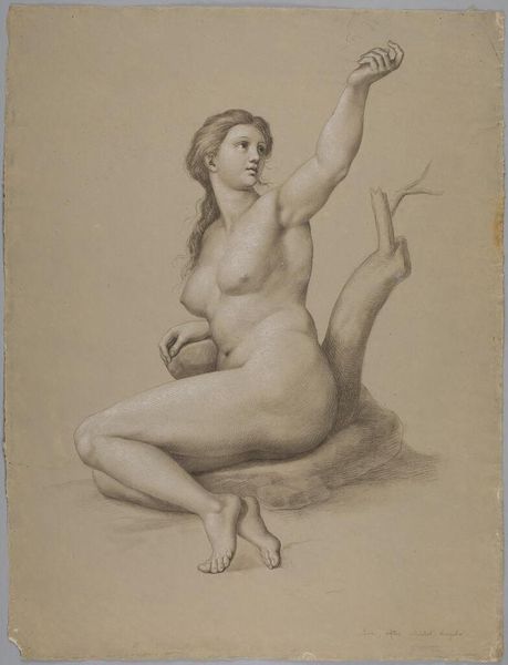Editor: This is Victor-François-Eloi Biennourry's "Eve: Detail from the Fall of Man in the Sistine Chapel." It’s a drawing. What immediately strikes me is how powerful Eve looks, almost challenging the viewer. How do you read this depiction within the broader context of art history? Curator: It's tempting to view this Eve through a feminist lens. Consider the historical power dynamics inherent in the Fall narrative: is she a temptress or a figure of nascent knowledge? Biennourry painted this long after the Enlightenment. How does his work challenge or uphold traditional interpretations of the biblical story? Editor: That’s really interesting, it gives a new way to appreciate Biennourry’s piece. Thanks! Curator: My pleasure. Viewing art through a contemporary lens is essential to understanding how cultural narratives evolve.