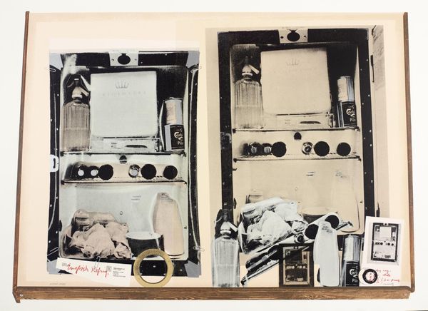 Editor: This is Howard Kanovitz's "American Fridge." It’s… interesting. Half of it is this stark, almost clinical photo of a fridge interior. The other half is this chaotic jumble of the same objects, deconstructed. What do you make of it? Curator: I see a pointed commentary on consumer culture and domesticity. The fridge, a symbol of American abundance, is dissected, laid bare. Is this an exploration of how we perform domesticity, measured by what we consume and display, or fail to display, in our refrigerators? Editor: That's fascinating! I was just seeing chaos versus order. Curator: Perhaps Kanovitz is suggesting that the idealized image of domestic order is a constructed myth, a collage that obscures a more complex and perhaps less palatable reality. What does the presence of the ruler and photos suggest? Editor: Maybe it's about the pressure to conform? This has given me so much to think about. Curator: Exactly. The beauty of this piece is its ability to speak to these cultural anxieties.