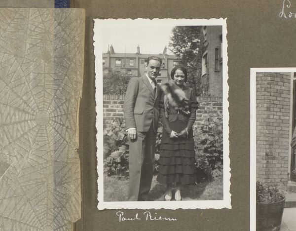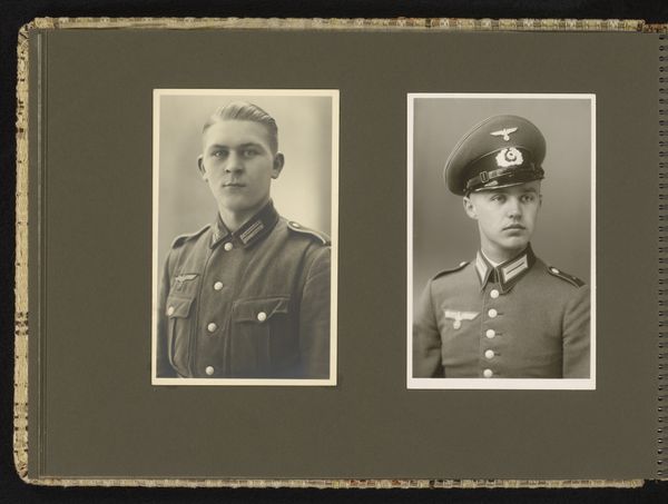 This is an anonymous black and white photograph presented in a family album, seemingly from the mid-20th century. The composition is symmetrical, with two portraits, presumably Werner Neufang and Thea Driesen, facing each other. The artist has used a dark backdrop to accentuate the light tones of the photos, drawing our eyes to the subjects. A childlike drawing of a heart links the two portraits, with the inscription 'Liebesleute', using basic semiotic structures to suggest unity, connection, and love. This arrangement creates a dialogue between the subjects, with the heart acting as a linguistic signifier of their relationship. It’s a symbolic gesture that seeks to challenge any fixed meaning beyond that of love. The album format and these personal touches introduce new ways of thinking about representation. This artwork functions aesthetically as a study in simple composition and affection and as a reflection of shared human experiences across time. This challenges the notion of art as something distant, highlighting its role in everyday life and personal connection.