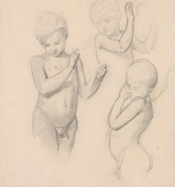 Curator: What strikes me most immediately about this piece are the graceful, almost ethereal poses of the figures. Editor: Indeed. The artist, Józef Simmler, created these Studies of boys’ nudes to the ceiling ‘Wedding procession of Cupid and Psyche’ in 1863, as preparatory sketches. You can clearly see the academic art influence in the way he renders form and anatomy using pencil. Curator: Preparatory sketches, you say? Looking closely, I’m interested in the paper itself. Was this common paper available for artists to create drawings of that time, and were these considered finished artworks, or merely byproducts of the "real" work? I’m also curious, were these figures based on living children, given how natural their postures seem? The production method piques my curiosity, challenging that fine art label by focusing instead on the labor. Editor: Excellent points. Within the broader context of 19th-century academic art, we see that drawing and sketching held significant value, particularly within institutions such as academies. Simmler was preparing to complete a large-scale, multi-figure painting. So, it's plausible these served both a functional purpose and showcased the artist’s technical ability to potential patrons and even to his academic peers. In that sense they become very important pieces on their own merit, beyond merely “sketches.” Curator: You raise an interesting issue on value! Speaking to the institutional influences, one considers the socio-political environment around depictions of the nude form and the artist's intentions. How would you say that shapes how these nudes may be received in society back then, if at all? Editor: Undoubtedly, the cultural and moral values of the time significantly shaped the production and reception of nudes, especially male nudes, which are rarer than female ones during the era. Here, we can think of the societal expectation on artists depicting nude forms, but not merely to sexualize figures. Instead, Simmler positions these children in line with mythological narratives like the Cupid and Psyche theme, effectively allowing his work to evade many constraints of the era. It's a brilliant move. Curator: A compelling argument. Well, looking at these studies and hearing of the larger work Simmler aimed for allows me a look into 19th-century labor, from access to tools, to paper quality, to its acceptance and display across venues—perhaps prompting us to reconsider what the artist labored for. Editor: Indeed, and through historical perspective, we’ve uncovered layers of context around what was initially perceived as merely simple pencil sketches.