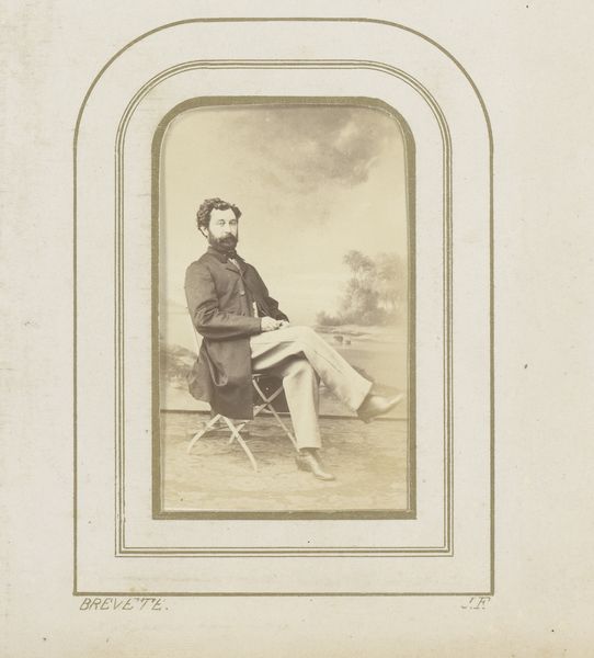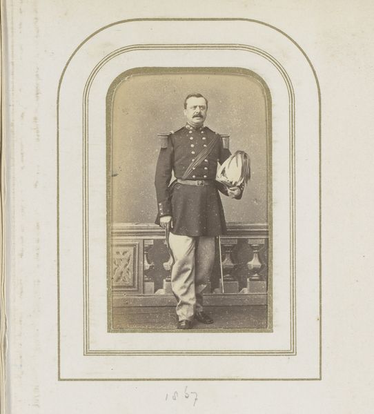 Curator: Immediately, the sepia tones create a strong sense of nostalgia. It’s like peering through a time portal. Editor: Indeed. This is "Portret van een man in uniform met pet en wandelstok," dating from 1860 to 1865, attributed to Prosper Bevierre. The medium appears to be a photograph with some kind of hand-applied toning, mounted on cardstock with a decorative border. What strikes you formally? Curator: The composition, while typical for a portrait of this era, uses diagonals in the figure’s pose and sword placement, which enlivens what could be static. Notice the subject’s confident stance, it conveys an air of authority, maybe even defiance, with the walking stick hinting that the officer may have suffered a serious leg injury. Editor: I’m drawn to how this portrait, as an artifact, exists within a network of production and consumption. Consider the materiality—the processed paper, the dyes used for the sepia tone, the very act of photographic reproduction making portraiture available to a wider section of society. We should also note how it functions within the military structure of the 1860s: mass-produced uniforms, standardised ranks indicated through specific accessories, the walking stick alluding to the military industry of healthcare and recovery. What narrative do these processes, materials, and allusions create? Curator: An interesting point! Looking at it more closely, it isn't just a generic military portrait; it may evoke a mix of power and vulnerability. There is a fragility in its presentation – mounted, bordered, presumably displayed and viewed privately or by a specific community. How the very form of photography changed visual representation…the portrait becomes an extension of the man, both in presence and status. Editor: Precisely! This connects the work, not just to individual artistic vision or skill, but to broader socio-economic transformations. Think about how the mass production and distribution of this medium helped visualize war efforts during times of immense global conflict. Curator: Ultimately, the photograph exists as an intimate and, perhaps propagandist, glimpse into a life. It gives you an aesthetic sensation from its monochromatic scale as well as its subject and historical content. Editor: So it invites us to examine not only the man but also the forces and industries that made his image—and perhaps his role—possible.
