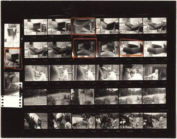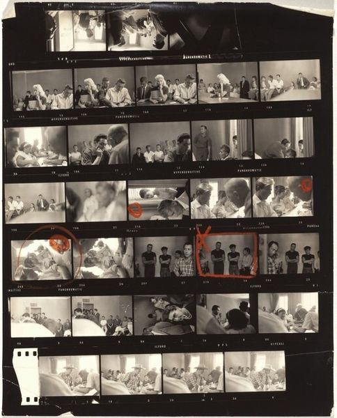 Robert Frank made this contact sheet, "Filming Elia Kazan's "Wild River"--Tennessee 7," using gelatin silver print. The whole thing is laid bare, here, for us to see. The artist's selections, his mistakes, his process! It's all part of the work itself. Look at the grainy blacks and whites, how they shift and change across the frames. The subject matter, the cars, the buildings, are interesting, but it’s more about the rhythm, the way the images echo and repeat. Like a song with a recurring melody. And then there's that orange marker, circling and crossing out images. Those marks become part of the story, adding a layer of decision-making, of editing. It reminds me of painting, where you're constantly adding and subtracting, building up layers of meaning through a process of trial and error. It's like Frank is saying, "This is how I see, how I choose, how I make sense of the world." It brings to mind the work of someone like Garry Winogrand, another street photographer who was all about capturing the messy, chaotic beauty of real life.