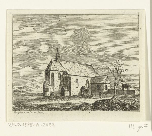 Ernst Willem Jan Bagelaar created this print of a chapel near Zellingen aan de Main. The composition balances architectural precision with the wildness of nature, a dance rendered meticulously in ink. Look at how Bagelaar uses horizontal lines in the sky to create a dramatic backdrop, in contrast to the geometric stability of the chapel itself. The building, with its solid form, is softened by the subtle variations in texture, inviting a deeper consideration. Notice also the bare tree, its branches reaching across the scene, adding a layer of semiotic complexity. The tree might be a symbol of mortality, yet it's integrated so seamlessly. The artist plays with the concept of space, using linear perspective to guide our eye. The way he etches the lines, not just to depict, but to suggest deeper themes of structure and place, is highly effective. One is left to ponder the relationship between human structure and the natural world.