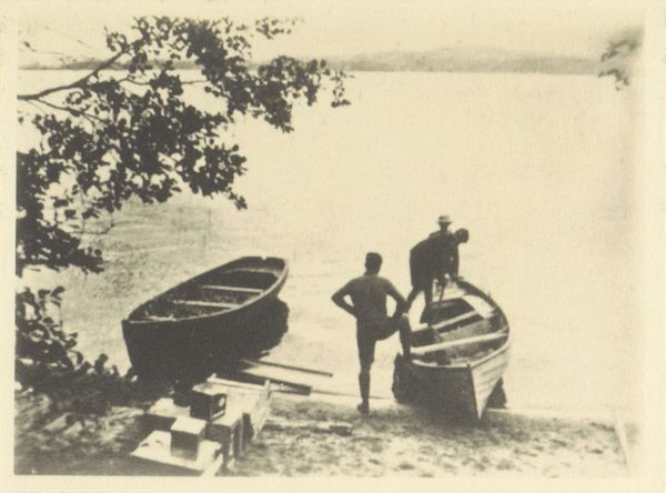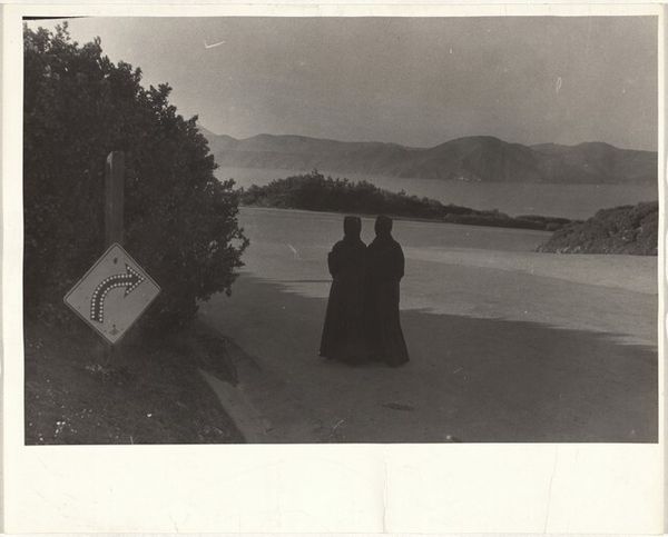 Editor: Here we have Bill Dane's gelatin silver print, "Untitled (Pt. Richmond)". It's a rather serene scene. I'm intrigued by how the composition directs my gaze across the water. What do you see in this piece from a formalist perspective? Curator: The photograph's strength lies in its tonal range and structured arrangement. Note the stark contrast between the dark foreground and the lighter expanse of water. The geometry of the concrete structures intersects with the organic forms of the tree and figures, creating a compelling visual tension. Do you find that contrast effective? Editor: Yes, the interplay of light and shadow really draws you in. I also appreciate how the figures are placed within the landscape, they almost seem secondary to the environment. I never thought of the geometry before. Curator: Precisely. The relationship between the constructed and natural elements, captured through Dane's sharp focus and careful composition, is key to understanding the image's formal power. Editor: I see. Analyzing the structure gives a new appreciation for the picture's stillness. Thanks for that.