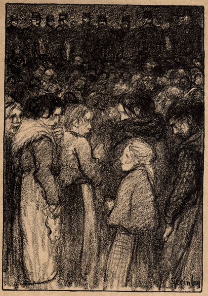 Editor: So, here we have Thèophile Alexandre Steinlen's "La Cite Rouge," an ink and pen drawing, though it is undated. It strikes me as a vibrant slice-of-life scene with some serious, maybe even tense, interactions happening in a crowded urban setting. It feels kind of gritty. What do you see in this piece, beyond the obvious genre scene? Curator: Beyond the surface, this drawing whispers tales of urban density, the human condition under pressure, maybe even survival in close quarters. It makes me wonder what narratives are swirling within those darkened buildings. Steinlen, who spent so much time documenting the margins of Paris, certainly has an ability to let the character of a locale emerge through the people who are milling through it. Does it feel timeless to you, or very much rooted in its era? Editor: I'd say both. There's a timeless quality to the crowded street and human interactions, but the style of clothing, and even the style of the drawing itself, makes it feel very grounded in the late 19th or early 20th century. The ink feels hurried, frantic almost. It's gestural. Curator: That tension you're feeling, I think, is everything. It's the tight composition pushing figures forward, almost onto the viewer. There's a stage play element that speaks volumes about how lives intertwine, conflict, and create the bustling heart of urban spaces. It is so of-its-moment while also conveying anxieties about urbanization and over-population that remain relevant today. Editor: Absolutely. It’s fascinating how Steinlen captured so much energy with just pen and ink. This has given me a totally new appreciation for the work, actually. It’s so much more than just a genre painting; it's a social commentary. Curator: Exactly. It captures a place and a feeling with an energy that you could almost bottle and sell.