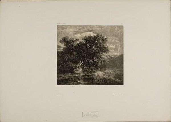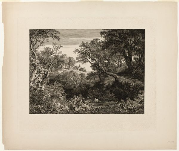 Editor: So, here we have "The Bush" by Charles-François Daubigny. It’s an etching, a type of print. I find the composition fascinating – the way the dense foliage sort of crowds the foreground. There's also something sort of melancholy and wild about it. What catches your eye about this work? Curator: That melancholic wildness is precisely it! It reminds me of bracing walks I took as a kid – facing the raw force of nature, almost being swallowed up by the elements. For Daubigny, I think this piece reveals more than just a scenic vista. What about the printmaking process itself? Can you sense anything of that struggle of creation here? Editor: Hmm, not immediately, but I do notice the incredible detail. Especially in the leaves and the sky. It seems difficult to achieve this level of detail using etching techniques. Curator: Exactly! Daubigny really pushes the boundaries of the medium. He captures not just the look, but also the *feeling* of the French countryside. Consider how the light breaks through the trees, almost like a fleeting moment. Editor: Yes! It’s there and then, it feels like, it will be gone again soon. Like a memory… Curator: Beautifully said. The whole piece hums with transience, that ever-present theme within Romanticism! And the figures on the path... tiny witnesses within this vast landscape. Are they hunters, maybe? Editor: It is interesting that you frame them like “witnesses.” I was mainly focused on the wild, central, bushy scene... Curator: Ultimately, Daubigny invites us to be witnesses as well – not just to observe, but to *feel* the bush. What a fantastic opportunity to see the natural world anew! What do you think about it now, at the end? Editor: That idea of "feeling the bush"... yes, I'm definitely taking that away with me. Thank you!