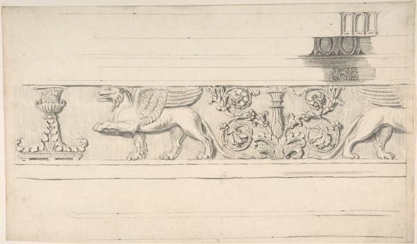 Moritz von Schwind created this delicate sketch titled "Entwurf zu einem Tafelaufsatz," a design for a table centerpiece, sometime in the 19th century. Schwind was working in an era deeply engaged with historicism, where artists frequently drew upon past styles. His sketch reflects the revival of classical forms, seen in the Pegasus figure and ornate decorations. Table centerpieces in the 19th century were more than mere decorations; they were signifiers of wealth and status, displayed prominently during elaborate social gatherings of the upper classes. Consider the elaborate nature of such a centerpiece, designed to impress and awe guests. It speaks to the power dynamics of the time, where such displays reinforced social hierarchies. The Pegasus, a symbol of inspiration and high-mindedness, adds another layer, suggesting aspirations to elevated social and intellectual status. As you reflect on this drawing, think about how objects, even those intended for display, carry the weight of societal values and power structures. They offer a glimpse into the lives and aspirations of those who commissioned and admired them.