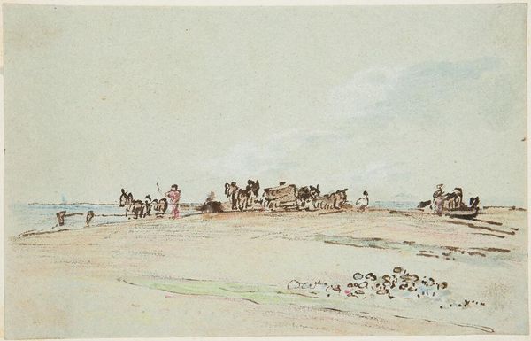 Curator: This watercolour, "Figures at the Beach," is attributed to the style of J.M.W. Turner and is currently held in the Harvard Art Museums collection. Editor: There's a breezy, almost ethereal quality to it. The figures are rendered so lightly, they nearly dissolve into the sand and sky. Curator: Turner's influence is clear, especially his interest in capturing atmosphere and the interplay of light on water. The beach was becoming an increasingly popular site for social gathering and leisure. Editor: The hats and bonnets on the figures denote class and societal roles, while also adding to the overall compositional rhythm. They seem to carry the echoes of British seaside culture. Curator: Precisely. Turner wasn't just painting scenes; he was documenting a shift in social practices, with the rise of leisure time and seaside tourism. Editor: It's a reminder that even seemingly simple scenes carry a wealth of cultural and historical significance. Curator: Indeed, seeing this artwork can make us reflect on how social landscapes have shifted in time, while still remaining grounded in similar activities.