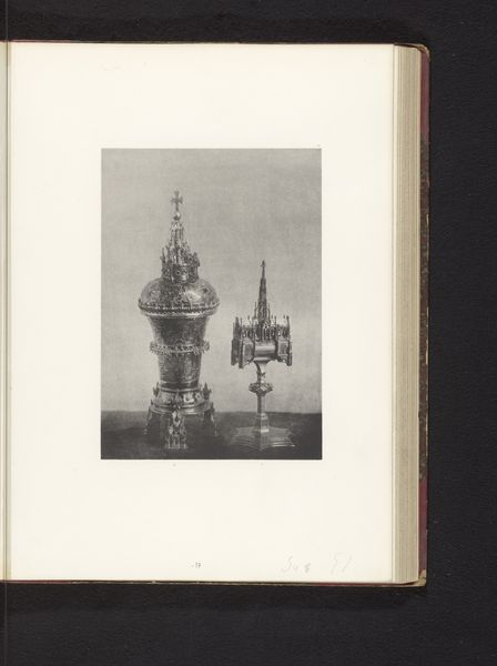 Editor: This is a photograph by Joseph Maes from 1864 depicting a monstrance from the Onze-Lieve-Vrouwebasiliek in Tongeren. It's made of metal and glass, and I find the rigid symmetry and central focus to be a very striking choice for that time. What do you make of its presence at an exhibition of religious objects during that period? Curator: The fact that this sacred object was part of a public exhibition in 1864 speaks volumes. Consider the 19th century as a period grappling with secularization and the rise of nationalism. Exhibiting the monstrance transforms it from a purely religious object into a cultural artifact. The context reshapes its meaning. What narratives of identity do you think the exhibition might have reinforced or challenged? Editor: I guess by putting it on display, it risks turning a spiritual symbol into something akin to a historical curio. Curator: Exactly. And think about who had access to these exhibitions. How does displaying religious artifacts to a predominantly secular or perhaps religiously diverse audience shift the power dynamics? Are we looking at a form of cultural appropriation, even if unintentional? Editor: So it becomes less about the actual religious function and more about…owning the narrative, perhaps? Asserting cultural dominance? Curator: Precisely! It invites us to question how institutions, even with the best intentions, participate in shaping perceptions of belief and cultural heritage. Considering also that religious objects often carry histories of colonialism and exploitation... Editor: I never considered all that complexity! I was so focused on the object itself. Thanks, that gives me a lot to think about. Curator: That is the purpose of art history.