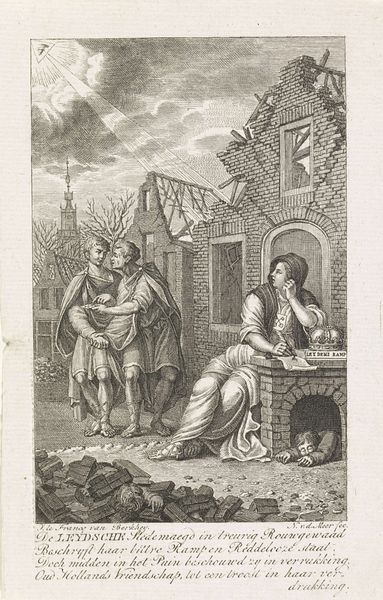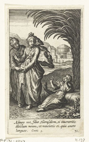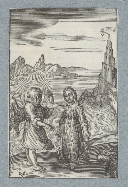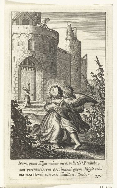 Editor: We’re looking at “Kind smelt onder hete adem van engel,” or “Child Melting Under the Hot Breath of an Angel,” an engraving made between 1590 and 1624 by Boëtius Adamsz. Bolswert, currently housed in the Rijksmuseum. It feels…intense, maybe a bit unsettling. What strikes you about it? Curator: Intensely intimate is how it strikes me. That delicate child, rendered with such tender lines, appears poised between the mundane and the divine, the literal heat and an allegorical spiritual trial, wouldn't you agree? I am transported into my inner child that melts to allow growth, but feels so overwhelming during it's processing of transformation. Do you feel transformed by looking at it, like something is liquifying inside of you? Editor: Liquifying...maybe! I hadn’t thought of it quite that way, but the image *is* pretty visceral. The figure of the child really dominates the composition, despite the strange tower in the background. Curator: Yes, and that tower – like a beacon in the spiritual landscape, juxtaposed with the vulnerable child – is like an anchor holding both earthly yearning and the possibility of redemption! Imagine the artisan shaping that plate in the opposite direction as the composition reveals; consider what an intimate spiritual exercise that carving and shaping would've required. Editor: That makes me consider the line work more closely... it's so intricate, so controlled. It reminds me a little of older Northern Renaissance prints. Curator: Exactly! Though it definitely displays Baroque flair. I like to consider the allegory of alchemists melting precious metals with hot air from focused blow-pipes. I wonder how we ourselves can allow 'angels' into our lives for support? Editor: I never would have connected alchemy to angels. This has given me a lot to consider. Curator: For me, these unexpected dialogues, melting-away inner rigidities and forging novel, tender pathways is why art lives!