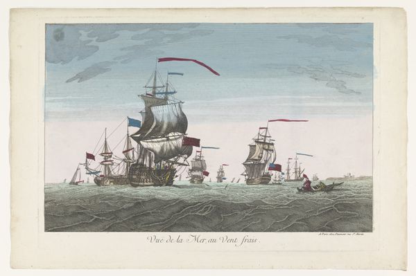 Editor: This etching, "Toren van Belém in de rivier Taag gelegen" by Pieter van den Berge, probably created sometime between 1694 and 1737, presents a scenic view of the Belém Tower in Lisbon. I’m struck by the contrast between the imposing tower and the lively maritime activity. What catches your eye in this piece? Curator: What I see is a portrait of power dynamics rendered through landscape. The Belém Tower, a symbol of Portuguese maritime power during the Age of Exploration, dominates the scene. Yet, look closer: The bustling river, filled with diverse vessels, tells stories of trade, cultural exchange, and, undeniably, colonial exploitation. Consider the vantage point. Who is given the privilege to look, and from where? How might the local populations have perceived this imposing structure, versus the colonial traders? Editor: So, you're saying it's not just a pretty picture of a tower, but a representation of colonial power? Curator: Precisely. And the very act of depicting this scene – etching it, colouring it, disseminating it – reinforces that power. Who was this image intended for? How does it solidify a particular worldview, one that centres European dominance and expansion? The details, like the flags flown on the ships, speak to competing empires vying for control. What is omitted, or subtly included, might tell us even more. Consider who *isn’t* represented, or whose labor is implied but unseen. Editor: That makes me think about the people on those boats, their roles, and the larger system they were a part of. I never would have considered that! Curator: It's about recognizing the visual strategies employed to legitimize historical narratives. Understanding this print means looking beyond its surface appeal to interrogate the power structures it represents. Thinking intersectionally allows us to unveil these often obscured histories. Editor: This has completely changed how I see this image. It’s far more complex and unsettling than I initially thought. Thanks!