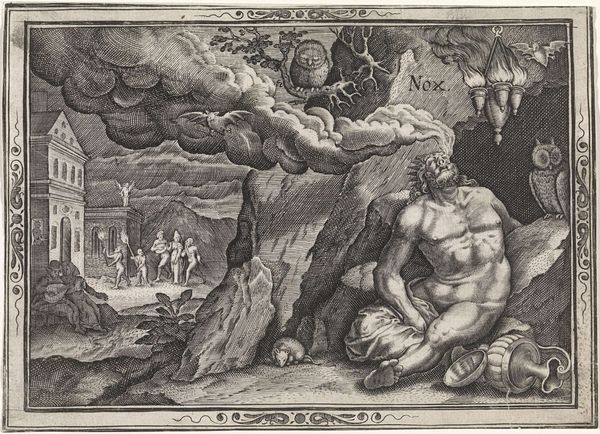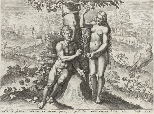 Curator: Looking at this etching, "The Sacrifice of Abel" from 1576, part of the series 'The Story of Cain and Abel' by Johann Sadeler I, I am struck by how it weaves together the religious narrative with details reflecting the artist's contemporary material world. Editor: The mood, for me, is overwhelmingly dramatic, isn't it? The figures seem so caught up, almost vibrating with emotion under that tempestuous sky. You feel a little sorry for them. Curator: Absolutely, but it is more than just emotional display. Consider the printmaking process. The lines are carefully etched and engraved, producing stark contrasts that would have been circulated as both art object and biblical instruction. The labor that goes into each line...it speaks volumes. Editor: And speaking of volumes, those are some beefy forearms on Abel! He’s built for hard work. But yes, you’re right, the physical effort put into creating the etching mirrors, perhaps, the effort that Abel makes in offering his sacrifice. Curator: Exactly! The very material used to depict the narrative elevates labor—both manual and agricultural—to the spiritual plane. How these objects were traded and understood by early collectors gives insights into social and religious values of the time. Editor: I like how the smoke rises and the light pours onto Abel; I'm touched by the very human reaching and receiving in such contrast to Cain's posture, almost turning away. Curator: We can read a story about spiritual devotion, as the text prompt in the engraving attests to, but it's vital to understand it within the history of printmaking as a craft, too. How many impressions of this print circulated to diverse locations and demographics? Editor: In that sense, each impression of the engraving itself mirrors Abel's continuous sacrifice. It becomes a repeatable act, available across time, a material record to ponder and reflect on the artist and on ourselves. Curator: The implications of this, its circulation and integration into different contexts… it pushes us beyond seeing simply an old biblical image, to considering the dynamics of power, religion, and creation of art at the end of the 16th century. Editor: Right. So much of seeing, really, comes from looking beyond what meets the eye. Thank you for pointing out just that, this conversation really brings it all together.