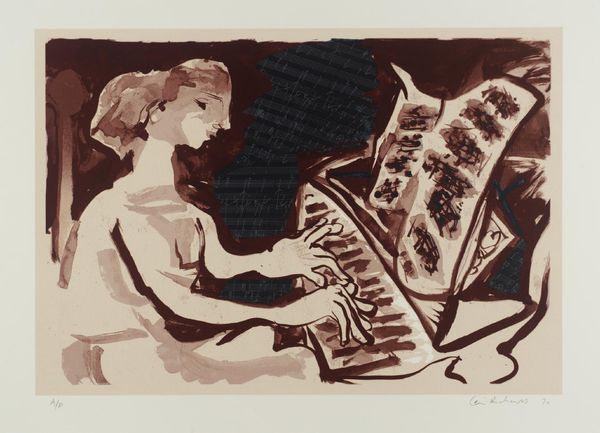 Curator: Henri Matisse's 1925 oil painting, "Woman at the Piano", is a fantastic example of his engagement with Intimism, which highlighted interior spaces and domestic life. Editor: It’s all warmth, isn’t it? It feels so… comfortable. Not just physically—like I could sink into one of those armchairs you see in old movies—but also emotionally. There’s something profoundly comforting about watching someone be engrossed in what they love. Curator: Absolutely. Matisse, working within the broader context of Modernism, used these intimate scenes to explore the gendered aspects of domesticity and creative expression. The woman's position, seemingly passively engaging with music, belies the complex role women played as patrons and muses within these spaces. How do you interpret that interaction between domestic space and creativity? Editor: You know, sometimes I think creativity blossoms when it's nurtured in cozy places. Imagine a life confined, then art as escape—it is almost an act of defiance. Those colors—the vibrant reds of the wall contrasting with the piano’s polished surface and her bright yellow stripes—they don't just feel decorative; they feel like an assertion of self, wouldn't you agree? Curator: The vibrant colours you’ve mentioned and use of decorative patterns can certainly be examined from a Postcolonial perspective. These elements invite examination of the relationship between representation, cultural exchange, and power dynamics, as he borrowed a great deal of North African textile patterns. It’s crucial to recognise this dynamic interplay. Editor: See, and that's why I think art is so alive, right? Because it changes meaning over time, through new perspectives. What began as an intimate portrait also mirrors back larger narratives. What a journey! Curator: Precisely! It makes you consider what might lie just beneath the surface, or in the history of these materials and inspirations. Food for thought indeed.