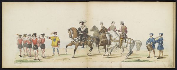 Editor: So this is "Maskerade van de Leidse studenten, 1855 (plaat 7)" by Gerardus Johannes Bos. It’s a drawing, in watercolor I think. I’m really struck by the attention to detail, especially in the costumes. It almost feels like looking at a stage production, not just a painting. What catches your eye when you look at this? Curator: Well, given the context – Leiden students in a masquerade – I’m drawn to think about the *production* of this kind of display. Where did these costumes come from? Were they made specifically for this event, and if so, who was making them? Think of the labor involved! The tailoring, the sourcing of materials… Even the horses themselves! Were they rented? Owned? There's a whole industry implied here, powering this brief moment of pageantry. Editor: That’s a really interesting perspective. I hadn’t considered the economics behind the masquerade. So you're saying the focus isn't so much on what they are doing, but on how they were able to do it? Curator: Precisely. Consider the watercolors. Why watercolors? What did that medium offer in terms of speed and affordability compared to oil paints, for instance, for documenting an ephemeral event? The choice of medium also tells a story about the constraints and possibilities of artistic production at the time. This isn't just an image, but evidence of how resources and artistic skill converged to create a visual record of a specific social practice. What message do you think that labor is intended to carry in the work? Editor: I think that focusing on the making of things rather than the appearance is interesting to highlight the cultural context of this historical event. Thinking about those makers makes it come alive. Curator: Agreed. By examining the materiality and means of production, we can uncover deeper meanings about social status, access, and the ways in which leisure activities are supported by various types of labor.