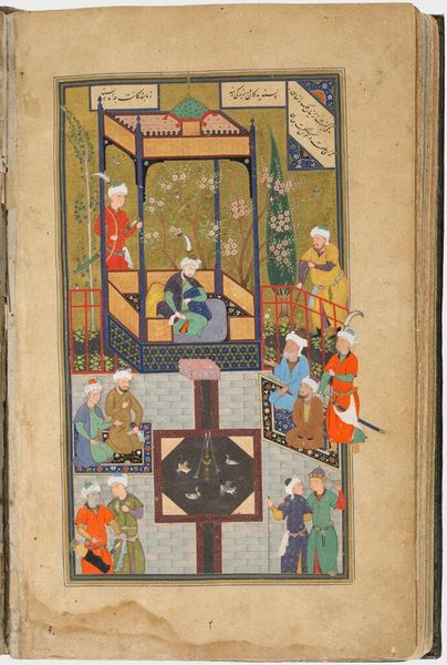 Editor: This artwork, entitled "Axendi mede vrouwe van den tienden mogol cha jehaan", is a watercolour painting that likely dates from around 1675 to 1755, by Adrianus Canter Visscher. Looking at it, I’m struck by how the artist segments the pictorial space. What do you see in this piece? Curator: The deliberate arrangement of forms into distinct registers commands immediate attention. Note how the architectural framework doesn't simply contain the figures but actively organizes them. It is a powerful compositional choice. Editor: So the structure dictates how we read the artwork? Curator: Precisely. The artist employs line and color to define each section. Observe how the vibrant hues of the figures' clothing create focal points within their respective compartments, yet these colors subtly echo each other across the levels, establishing a visual harmony and reinforcing the painting's formal unity. Do you notice that? Editor: I see that the different levels feature figures, with varying clothing in red, green, yellow and they reappear throughout the painting. Is this why you read the organization of this piece as powerful? Curator: Not solely, no. Examine the negative space as well. The artist's awareness is evident. Each spatial pocket interacts, shaping our perception, and inviting exploration. This masterful handling of positive and negative forms gives the piece dynamism. Editor: So, even without knowing the cultural background, by analysing the way the picture is put together, we can appreciate its artistic qualities? Curator: Absolutely. The arrangement creates inherent visual interest and rhythm, independent of any specific narrative content, creating tension, rhythm, and compositional integrity. Editor: That’s a fresh perspective. I was so focused on trying to understand what's happening, I missed the fundamental design elements. Curator: Formalism encourages precisely this: focusing on the artwork itself. Approaching the visual impact as separate from themes can clarify so much.
