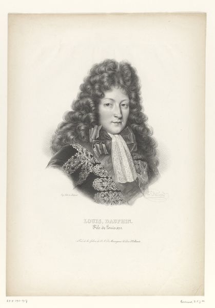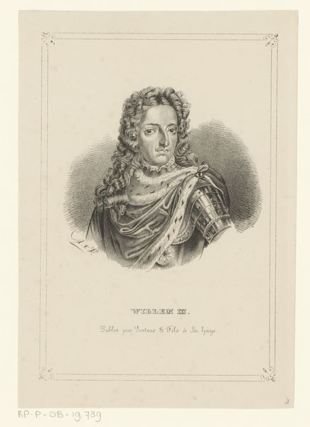 Editor: So, this is Antoine Maurin’s "Portret van Lodewijk Alexander de Bourbon, graaf van Toulouse," dating from 1835 to 1851. It's a pencil drawing and engraving. It’s interesting how he’s portrayed in armor but the lines are so delicate. What draws your eye when you look at this work? Curator: The figure is framed and ennobled with period regalia, referencing status. The armour hints at the Count's martial prowess. What intrigues me most is the powdered wig—an incredibly potent symbol within this cultural moment, a performative presentation of identity in contrast to natural, flowing hair. Why do you think Maurin emphasized it so? Editor: I hadn’t thought of the wig as being so significant. I was mainly focusing on the textures, but thinking about it as a signifier changes everything. Maybe it's a marker of belonging to a certain class, a kind of uniform? Curator: Precisely. The wig as uniform. Consider too that Louis Alexandre de Bourbon was the illegitimate son of Louis XIV, legitimized but always marked by that history. The wig then also becomes a means to mask, to project authority in spite of his lineage. And the artist's choice of delicate lines is very telling! Don't you think it makes a contrast with his military purpose, like something in between force and power? Editor: That's a fascinating interpretation. I was so focused on the aesthetics that I missed the symbolic layers completely. Thank you, I learned a lot from your interpretation! Curator: It's through the interweaving of history and symbol that art truly speaks to us across time, inviting contemplation, no?