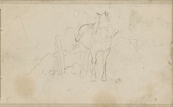 Curator: Here we have Johannes Tavenraat’s work, "Vlak landschap met een paard," which translates to “Flat Landscape with a Horse,” made sometime between 1864 and 1880. It’s currently held here at the Rijksmuseum. The medium involves both ink and watercolor on paper. Editor: My first impression is a kind of faded grandeur. The sepia tones evoke a sense of nostalgia. And the horse, although centrally placed, looks quite isolated in this flat landscape. There's an unfinished quality too, in the blots and uneven washes. Curator: Indeed. Tavenraat was working within a cultural milieu deeply engaged with notions of the picturesque. His contemporaries, particularly within the Hague School, were also capturing scenes of Dutch life with a similar melancholic undertone. Consider the rise of landscape painting within this period; a romantic, almost nationalistic, view of the land takes hold. Editor: The technique is fascinating. The way the watercolor is applied – seemingly spontaneously. Those drips and spots might initially seem accidental but add a sense of texture and movement, particularly around the horse's mane and flanks. Are we meant to see this looseness as artistic freedom, or a comment about something else entirely? Curator: We might interpret the sketchiness as suggestive of a transient moment—an 'impression', if you will, which predates Impressionism proper but shows that he was an adopter of it. Consider the compositional choices too: the low horizon line accentuates the flatness of the landscape, thereby amplifying the horse's presence. It begs the question – what symbolic load does this horse carry? Editor: And that solitary windmill barely suggested in the background further emphasizes the sparseness. I’d wager that the horse, rendered with so much tonal contrast, becomes almost monumental despite its modest size. There’s a distinct focus on its shape and the contrasts and values around it to draw our attention to its structural anatomy. Curator: I think you’ve nailed it. This piece really encapsulates a turning point in art. Tavenraat straddles the academic and the modern. It’s a testament to a period grappling with its own identity. Editor: An apt summary! I will certainly leave with an enhanced view of how simple materials expertly applied, can evoke deep thoughts and emotions about our history.
