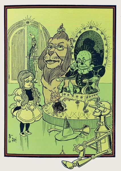 William Wallace Denslow created the illustration, You Must Give Me the Golden Cup, during a time when the cultural landscape was shifting. The Wizard of Oz, written by L. Frank Baum and illustrated by Denslow, was breaking away from traditional children's stories, offering a uniquely American fairy tale that reflected the country's evolving identity. Denslow's illustrations provide insights into early 20th-century perceptions of gender and power dynamics. We see Dorothy, a young girl, at the center of the narrative surrounded by iconic characters. Note the women in power: one regal and seated on a throne, the other a girl soldier. Their presence challenges the traditional damsel in distress. Meanwhile, the Cowardly Lion and Tin Man represent emotion and humanity. These characters, who are seeking something they believe they lack, mirror the human desire for completeness. Denslow's art invites us to consider how stories shape our understanding of ourselves. It reflects the emotional, social, and personal journeys we all take as we search for courage, heart, and home.