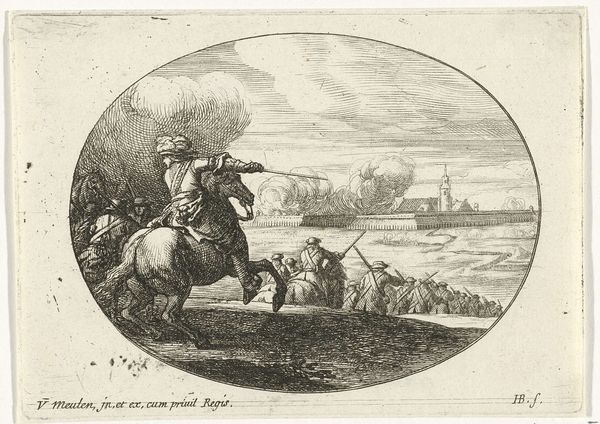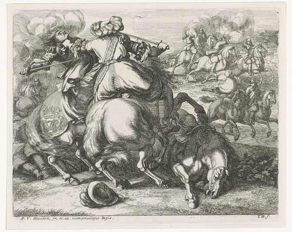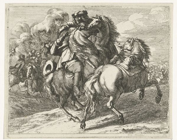 Curator: Let's examine "Zwaardgevecht tussen twee ruiters," or "Sword Fight Between Two Riders," an engraving by Jan van Huchtenburg dating from around 1673 to 1709. Editor: What immediately strikes me is the tension! Even though it’s just black lines on paper, I can almost hear the clash of steel and the horses' panicked breaths. Curator: Notice the dynamism van Huchtenburg achieves through the swirling composition. The intersecting diagonals of the riders, horses, and weaponry create a vortex that pulls the eye into the center of the conflict. Observe, too, how he employs cross-hatching to define volume and texture, giving form to the figures and the billowing smoke of the battlefield. Editor: That smoke feels significant. War wasn’t glorious for the rank and file, especially if you consider how military conflict affected civilians. Engravings like these were often commissioned by the victors, right? To celebrate power. I can't help but wonder about the lived experience of this anonymous battle, the muddy trenches, the suffering… Curator: Certainly, van Huchtenburg focuses less on individual suffering and more on the overall spectacle of combat. His meticulous detail in rendering the horses' musculature and the soldiers' attire suggests a fascination with martial skill and aristocratic prowess, idealized battle scenarios. Editor: An ideal, far removed from reality for many involved! The very act of creating and distributing images like this underscores who has the privilege to shape history and whose stories remain untold. Where are the common soldiers here? Where are the perspectives of those most vulnerable to war’s ravages? Curator: Your concerns touch upon questions of representation. However, within its formal constraints as an artwork, van Huchtenburg's piece stands as a noteworthy demonstration of Baroque dynamism and compositional strategy. Editor: Still, viewing art as just skill ignores the powerful political undercurrents. Recognizing its place within systems of power allows for richer engagements. Curator: A viewpoint indeed. Editor: Food for thought, for sure.