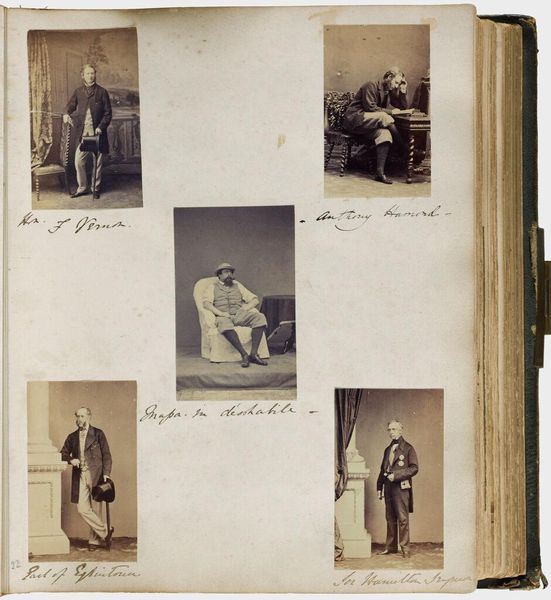 Editor: Here we have "Javaanse vorsten," taken by Woodbury & Page between 1863 and 1866. It’s a photographic album page, and I’m immediately struck by the formal poses and the very deliberate compositions. What social dynamics are at play here? Curator: That’s a perceptive question. This work is part of a much larger, complex colonial narrative. Photography, at this time, served as a tool for Western powers to document and, in many ways, classify colonized populations. Who do you think the audience was for images like these? Editor: Probably people back in Europe? It seems like a way to reinforce a sense of power, right? Curator: Precisely. These aren't just portraits; they are visual statements about control and otherness. Consider how the subjects are dressed and posed – often in ways that conform to European expectations. The backdrop, the props, even the act of being photographed, become performative acts within a power structure. What can you say about the fact they are all Javanese Royals, not just common people? Editor: Hmm... perhaps these portraits are designed to show the ‘hierarchy’ of colonized Java, almost like a cataloguing of rulers? To show Europe who's who? Curator: Yes, to display, classify, but also manage the existing power structures for efficient rule. Were the Javanese given any real agency in deciding how they would be represented? Who controlled the narrative? Does that make these portraits less genuine? Editor: Definitely, if it’s mostly for the benefit of colonizers rather than genuine artistic expression by or for the Javanese community. Curator: It highlights the complex relationship between art, power, and representation. It encourages us to question the photographer's intent, the viewer's interpretation, and the subject's agency. Editor: So it is essential to be critical and view these images with awareness. This has changed my perspective on the photograph.