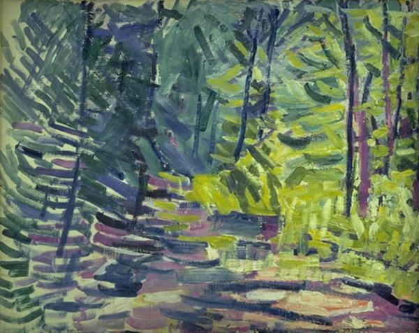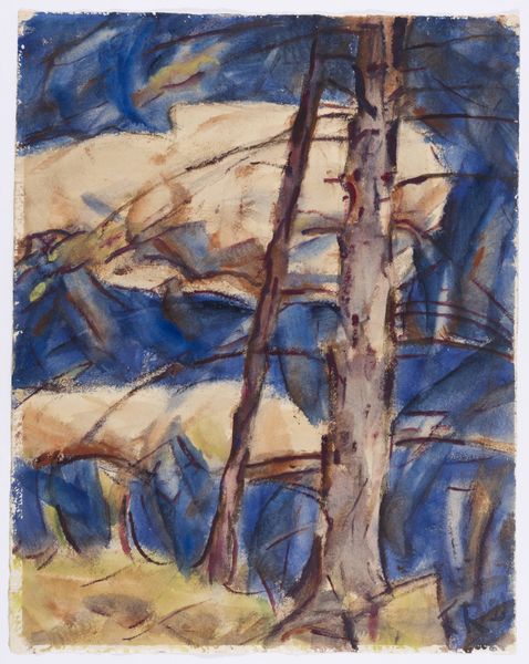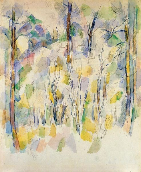 Editor: So, this is Paul Cézanne’s "In the Woods," a watercolor on paper created around 1896. It's giving me a serene, almost hazy, feel. The trees feel less like individual entities and more like a collective impression of a forest. What do you see in this piece? Curator: You know, when I look at it, I'm immediately struck by this feeling of… walking into a memory. Cézanne's dissolving the traditional landscape; he's not so much painting trees as painting the act of *seeing* trees. Do you see how the brushstrokes are almost independent units? Like he's trying to build up the space rather than depict it. Editor: Absolutely! It's less about precise representation and more about capturing the feeling of being there. Almost abstract, right? Curator: Precisely! It is like Cézanne's asking us, “What does it mean to really look at something? To understand its structure beyond surface appearances?" Look how the watercolor almost breathes, allowing the light to filter through. Editor: I hadn’t considered how he breaks down perception itself! It's as though he's analyzing how light and shadow define space, and reassembling it for us. It makes me consider how much is missed if one doesn’t take the time to really *see* a thing. Curator: And that, I think, is Cézanne's quiet rebellion, and lasting brilliance. It changed how painting can teach us.