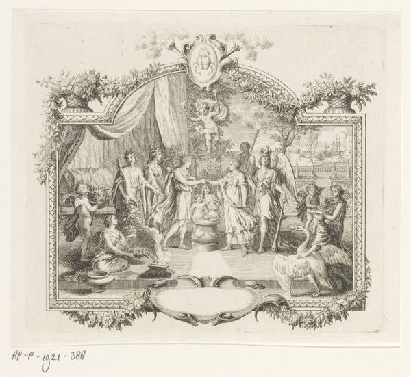 Curator: Here we have "Nobility Presenting an Infant to Venice" by Francesco Zugno, an Italian artist active during the 18th century. It's a pencil drawing, a preparatory study, residing at the Metropolitan Museum of Art. Editor: The ethereal quality of this work immediately strikes me. It feels like a half-remembered dream, or a fading emblem. The round composition almost makes it resemble a coin or a commemorative medallion, even if the material, a drawing, stands apart from that impression. Curator: Absolutely, that circular format lends it an almost self-contained quality, a portable symbol. It focuses attention. Note how Zugno utilizes a dense network of lines to model form and light; the physical act of applying pencil to paper to communicate status, worth. Think about what a laborious, demanding undertaking that must have been! Editor: The central figures, especially the enthroned Venice and the infant presented to her, radiate authority, drawing inspiration from traditional representations of the Madonna and Child, reinforcing the importance of dynastic succession. This deliberate deployment of established imagery gives Venice both power and a spiritual, almost divine right to rule. Note also the careful and meaningful inclusion of Saint Marks lion. Curator: And behind Venice, consider the meticulously rendered drapery; Zugno skillfully utilizes varying pencil strokes to capture the heavy folds of fabric. These are material objects indicative of the noble status, indicative of how wealth and skill are materially interwoven here. These kinds of works allow us a lens into period studio practices. Editor: Exactly. It underscores the weightiness of the occasion, visually expressing both the burden and the promise inherent in this symbolic presentation of an heir to Venice. The infant becomes more than a child; he is an allegory of hope, of continued Venetian dominance. Curator: Indeed, the artwork itself becomes a tangible symbol of cultural and political aspirations. Thinking through these details illuminates art making as an activity anchored to broader issues related to its socio-historic location. Editor: Agreed. Seeing it now, it feels richer, weighted with implications—a delicate balance between tangible materials, enduring images and symbols. Curator: Precisely. And the pencil medium reminds us that even the most imposing displays of power start with human labour.