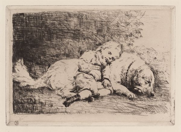 Curator: William Dyce, active during the Victorian era, created this lovely etching, "Boy Reclining by a Pool." The image dimension is 83 x 127 mm and it resides in the Tate Collections. Editor: It's incredibly delicate; I'm immediately drawn to the rough, almost scratchy texture of the etching and the way it captures the light. Curator: Considering Dyce's engagement with High Anglicanism, I wonder if the reclining boy is intended as an allegory, perhaps on the cusp of awareness, reflecting themes of innocence lost or found within a broader spiritual narrative. Editor: Or maybe it’s simply about the working conditions of children at the time? How the artist can capture that through the medium, ink, paper, the etching process, all those factors have a say in the final outcome. Curator: That is one way to look at it; I lean towards the boy representing a symbolic threshold, inviting reflection on social progress and the evolving role of the child within Victorian ideology. Editor: I suppose both readings are possible, especially when you consider the materials and the context where it was produced. Curator: Indeed, a beautiful glimpse into the dialogue between art and its era. Editor: A fascinating piece, offering so many layers to unearth.