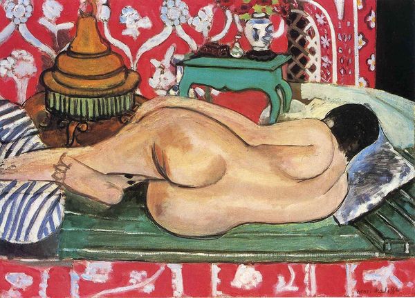 Curator: Here we have Henri Matisse’s "Reclining Odalisque," painted in 1926 using oil on canvas. Note how it embodies both the Fauvist and Orientalist styles he often explored. Editor: My first thought? What a mood. It's opulent, lazy, maybe a little bored. The colours practically vibrate, and she's just *there*, unapologetically taking up space. Curator: Indeed. Observe the intricate patterns: the geometric wallpaper juxtaposed with the softer lines of the figure and fabrics. There's a definite tension between the constructed space and the natural form. Do you pick up on that clash? Editor: Absolutely. It's almost theatrical, like she's a performer in her own private stage set. And the bold palette! That cadmium yellow lamp base—it’s less object, more explosion of light. I feel like I'm peeking into a very intimate, yet meticulously arranged scene. Is this staged sensuality, I wonder, or a candid moment captured in riotous colour? Curator: Considering its historical moment, one might suggest it delves into Orientalism, which often uses symbolic elements and poses to evoke a sense of exoticism and eroticism. However, the nude is gazing out as if defying our gaze at the same time, do you think it subverts, slightly, such orientalist stereotypes? Editor: Definitely, there’s a challenging gaze. But beyond the "who's looking at who" power dynamic, there’s something else there. Matisse renders her with an affection, like he sees the real woman beneath the decorative artifice. That humanity peeks through the bold color choices. Curator: Agreed, Matisse presents a study in contrasts. The composition itself – consider the placement of the golden lamp. He frames the figure as an intimate scene in what otherwise seems a public, albeit constructed space, what do you take of that composition decision? Editor: I love how that gleaming form kind of "interrupts" her space. The juxtaposition adds to the feeling she is a specimen but an utterly, compellingly *human* one. This odalisque isn't just some generic nude. There is intelligence in her features, that somehow makes the space less abstract than initially presumed. Curator: Precisely. Through line, color, and form, Matisse delivers not just an image, but a conversation. A challenging composition which demands to ask whether it reflects cultural fetish or if Matisse achieves the means to deconstruct this in painting form? Editor: Yes, “deconstruction”, because like many artists, I feel Matisse questions representation of not only woman form but also his vision on a place he romanticised. Leaving the observer to complete such experience! Curator: Well said, making one truly appreciate the way form is presented here, a captivating invitation into artistic contemplation. Editor: Absolutely! Colour, shape, history – Matisse really packs it all in, doesn’t he?