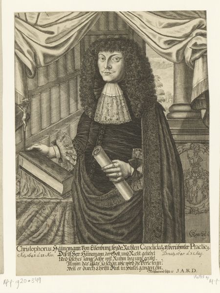 Pieter van Gunst’s portrait of Heinrich Winckler captures the sitter in a posture of authority. Van Gunst, who lived between 1659 and 1724, was working in a Dutch society deeply shaped by its religious and social hierarchies. Winckler is depicted with symbols of status: his elaborate wig, fine clothing, and confident pose, all speak to his position in society. Yet, it is the painting in the background, depicting the crucifixion, that adds a layer of complexity. This inclusion of the crucifixion alongside Winckler subtly comments on how identity is constructed through faith and status. The text at the bottom of the portrait reinforces themes of piety and virtue, common ideals of the era. I find myself thinking about what it must have meant, emotionally, to be a man of Winckler's position, navigating the demands of faith, duty, and status in 17th-century Dutch society. Ultimately, this portrait encourages us to reflect on how societal values influence individual identity. It is a record of a specific person but also an artifact of the broader cultural values that shaped his world.