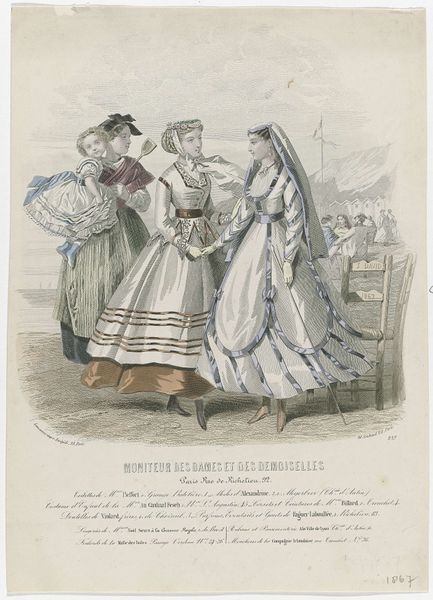 This print of three women from Bordeaux in traditional dress was made by Aimé-Henry-Edmond Sewrin-Bassompierre, though we don’t have a specific date for it. It's a lithograph, a process that democratized image-making in the 19th century, using a flat stone or metal plate to transfer an image. The appeal of lithography was its relative ease and speed, allowing for mass production and wider distribution of images. You could even use color! This print showcases that capability with delicate pastel hues. It's important to remember that prints like this, made for popular consumption, involved many hands, from the artist to the printmakers and publishers. The image speaks to its time, a moment of industrialization where traditional crafts and cultures were increasingly seen as commodities. These women, in their carefully rendered costumes, become objects of visual consumption, their identities somewhat flattened and re-presented for an audience eager to consume images of other places and peoples. It prompts us to reflect on the value and impact of materials, making, and context in understanding the full meaning of an artwork.
