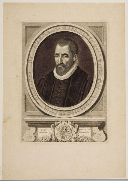 Curator: Welcome. Today we’re examining Pieter Sluyter’s "Portret van Denis P\u00e9tau," an engraving dating back to between 1696 and 1713, a captivating portrait residing here at the Rijksmuseum. Editor: Immediately, the lines, etched with such precision, suggest a kind of… austere elegance. It is almost haunting, the way the face emerges. Curator: This engraving reflects the conventions of Baroque portraiture, particularly regarding representing scholars or figures of authority. The clean lines give it a structured form and gravitas. Denis P\u00e9tau was a very influential French Jesuit theologian and chronologist of his time, if that’s any indication. Editor: It’s fascinating how his intellectual gravitas, as you say, seems inseparable from his social position. Look at the way he is framed within that oval, it is an almost symbolic elevation above us as viewers, and further emphasizes this separation by adding an additional frame containing his name. Does this presentation serve to reinforce certain hierarchical social structures? Curator: Undoubtedly. The medium itself – engraving – lent itself to reproducibility, so images like this would circulate amongst the intelligentsia of the period, almost like celebrity endorsements of today. P\u00e9tau was a towering figure in intellectual circles. His presence in these circulated images would solidify that social position that we’ve described. Editor: And let’s not ignore the use of light and shadow here. While seemingly simple, the artist uses this tool to great effect and adds emotional depth to the representation. Are we meant to perceive some internal conflict or an almost existential pondering etched onto his very face? Curator: That's a provocative interpretation, however one may read such “conflict” as an indication of intellect or sophistication for potential clients or other learned onlookers during the Baroque era. Editor: Perhaps you’re right. It could be a display. But I also wonder about the implicit power dynamics. Does Sluyter capture P\u00e9tau, or does P\u00e9tau, in his status, in some way define the very limits of this portrayal? Curator: An interesting perspective. Editor: Yes, the tension between representation and self-representation. Food for thought, isn’t it?