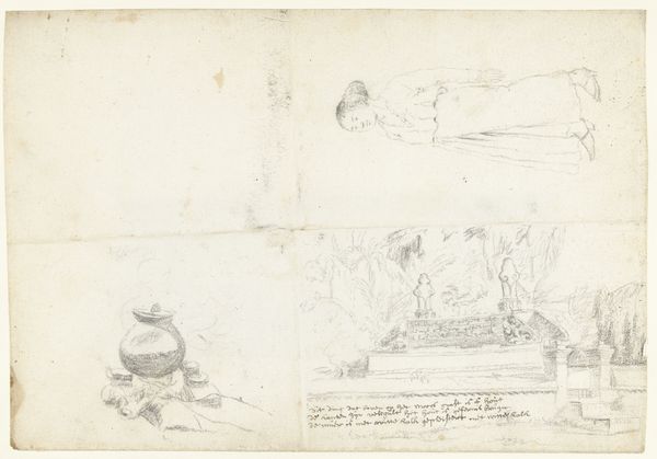 This graphite drawing on paper, "Wandelaar, honden, vogels en een brug in Park Angerenstein te Arnhem," was made by Johannes Tavenraat around 1833. It depicts a figure walking with dogs and birds in the Angerenstein Park. The drawing invites us to consider the changing role of public spaces in the Netherlands during the 19th century. Parks like Angerenstein were not simply natural landscapes, but carefully designed spaces reflecting social and cultural values. The figure's attire and leisurely activity suggest a certain social class, highlighting the park as a space for the well-to-do. The presence of dogs and birds hints at hunting, a popular pastime among the elite. To fully understand this work, we might explore estate archives and period publications relating to the Angerenstein Park and the leisure activities of the Dutch upper class. This will shed light on how art reflects social practices and the use of public spaces in 19th-century Netherlands.