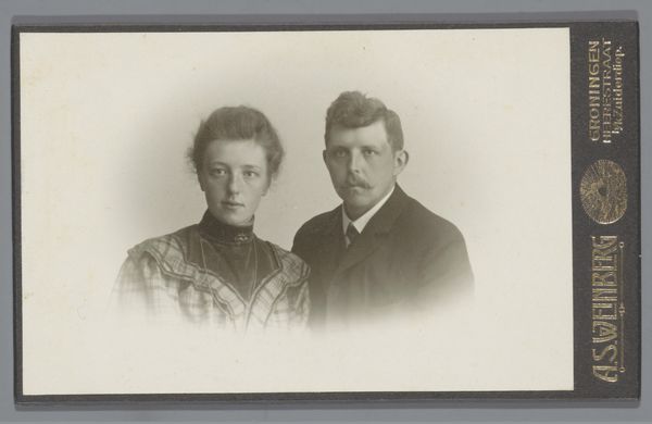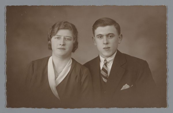 Curator: Here we have "Portret van Oom en Mies Schürer," a photograph taken sometime before 1895 by Gerrit van der Mey. What are your initial thoughts? Editor: The sepia tones lend a softness, almost a romanticism, to this formal portrait. It's interesting how the subjects engage directly with the camera, inviting the viewer into their space. Curator: Precisely. Looking closely, one notes the process and conditions of photography at the end of the nineteenth century. We're witnessing early photographic technologies used to cement social standing. What do you notice about their attire? Editor: The fabric of her dress catches my eye. The dress itself, and his suit. It's fascinating how textures are rendered despite the limitations of the photographic medium. Also notice her lace collar. Curator: The choice of attire and the pose suggest a particular performance of social identity. They chose clothing and items like jewelry that communicated something important to themselves and viewers in their community. This image provided evidence of belonging. Editor: There is also a distinct symmetry at play within the portrait's architecture. They create a solid presence despite the quiet lighting. The interplay between light and shadow shapes their faces and forms, offering both definition and softening. Curator: Absolutely. Consider too, the act of sitting for such a portrait, a ritual signifying the couple’s status and perhaps aspirations within their social milieu. Editor: And consider van der Mey’s mastery of composition and light in such an early photograph. There is a deep sense of intimacy here; he’s capturing more than mere likeness. It is quite a technical and an artistic achievement. Curator: Understanding photography in its historical moment offers a new framework through which we see and relate to each other now through the media we've come to expect in every day life. Editor: Yes, this encounter reminds me to look beyond what is simply pictured to appreciate what the image does to move and shape the space around it.