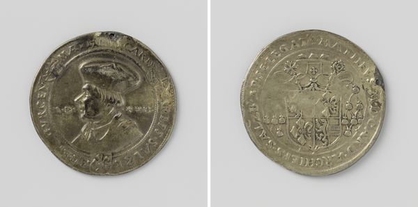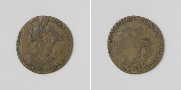 Editor: This metal membership medallion, dated 1642, is titled "Rederijkerskamer het Bloemken Jesse te Middelburg onder de kernspreuk 'In minnen groeyende'," which is quite a mouthful! It feels intricate but also very... encoded. What do you see in this piece? Curator: I see a rich tapestry of symbols, revealing cultural memory woven into this object. This isn't just a pretty trinket; it's a key to understanding the intellectual climate of the Dutch Golden Age. Notice the prominent imagery – the central tree, for instance. Does it evoke anything for you? Editor: It reminds me a bit of the Tree of Jesse from the Bible... is that relevant here? Curator: Absolutely! The "Bloemken Jesse," or "Little Flower of Jesse," refers precisely to that genealogical tree depicting the ancestry of Christ. These Chambers of Rhetoric, the Rederijkerskamers, often staged plays with biblical themes, subtly blending religious allegory with contemporary societal concerns. The imagery of growth, as the motto "In minnen groeyende" suggests, highlights a communal aspiration toward both artistic and moral betterment through love and harmony. Editor: That’s fascinating. So the figures on either side of the tree...they must be symbolic too? Curator: Indeed. Consider their placement, their gestures. What narratives might they be enacting in relation to this symbolic Tree? Their clothing, their poses, the objects they hold-- all speak to complex allegorical traditions that resonated deeply with audiences of the time. The medal serves as a cultural anchor, reminding us how symbols accrue meaning across generations. Editor: It’s amazing how much meaning is packed into something so small and old. It really makes you think about what symbols we use today that will resonate with people centuries from now. Curator: Precisely! And how those symbols might be reinterpreted or even forgotten, transforming their cultural weight across time.