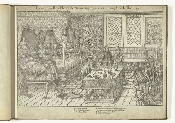 Curator: Editor: Here we have “Sterfbed van Prins Maurits, 1625,” a print made in 1625. The scene depicts Prince Maurits on his deathbed. It feels like a very formal, staged moment, even in death. How do you interpret this work? Curator: The print offers a glimpse into the constructed nature of power, particularly at a moment of vulnerability. Deathbed scenes were often staged and circulated as prints to control the narrative surrounding a ruler’s legacy. What do you notice about the figures surrounding Prince Maurits? How does their presence shape your understanding of the scene? Editor: They all seem so still and composed, almost like they're posing for a picture rather than mourning a loss. The man in the center is holding Maurits' hand as if signing a deal. It looks like everything had to be official, and they made sure this moment was captured and circulated to solidify the dynasty's future. Curator: Precisely. Think about the symbolism embedded in the scene. The ornate bed, the carefully positioned figures – they all contribute to a carefully curated image of authority and succession. How does understanding the historical context of political power struggles influence your perception of the print? Editor: Knowing that these prints were used as propaganda gives the scene a new layer of meaning. It becomes less about grief and more about maintaining control, even in the face of death. It seems more calculating now. Curator: Yes. By examining the role of this image and how it participates in larger conversations of power, gender, and legacy, we recognize the cultural meanings assigned to the event depicted. Does thinking about the print as a carefully constructed piece of political messaging change your view on the historical figures present? Editor: It makes me see them as active players in a much larger game, concerned about projecting an image of stability and control rather than simply mourning the Prince. Curator: Absolutely, and hopefully, looking at it through this lens enriches your appreciation of its complexities.