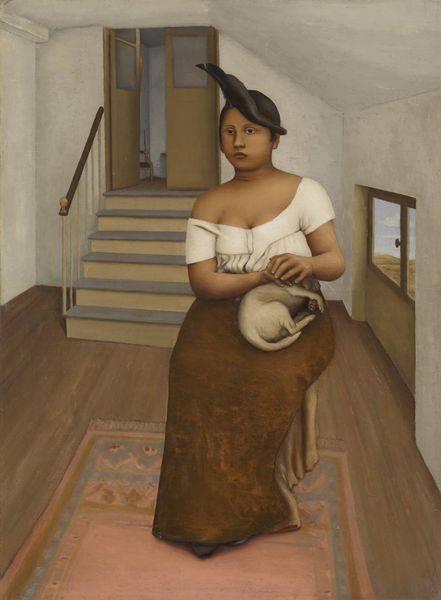 Roberto Montenegro's 'Tehuana', captures a seated woman, flanked by a vase and basket. The Tehuana’s traditional garb, specifically the resplendent headdress, symbolizes cultural identity and matriarchal strength. The woman’s head covering connects to ancient veiling customs across cultures, from Rome's Vestal Virgins to Byzantine empresses; a symbol of modesty, protection, and power. Yet, the simple dress and crossed arms here suggest both restraint and a deep inner reserve. Consider too, the objects beside her: the vase, an ancient symbol of containment and potential, and the basket, suggestive of harvest and abundance. Such vessels, recurring throughout art history, echo primal notions of fertility and sustenance. Observe how Montenegro captures a moment suspended between tradition and introspection, engaging our collective memory and subconscious understanding of cultural symbols.